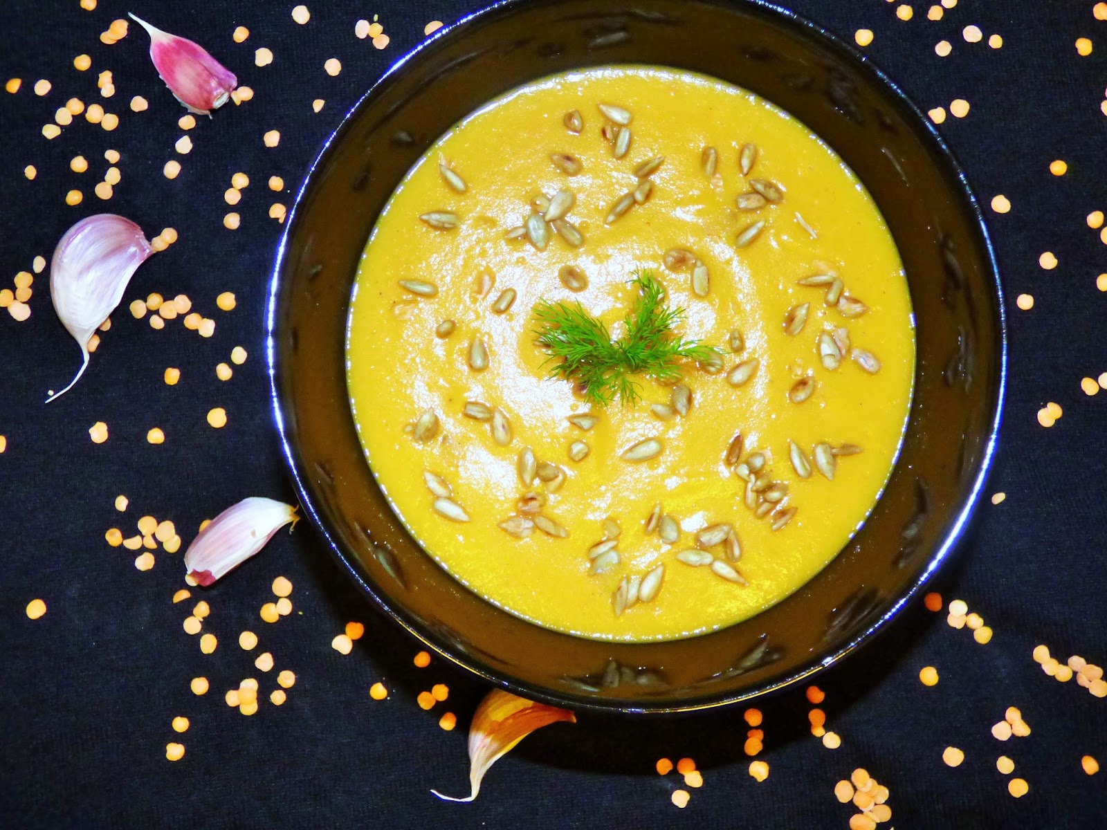 Cebule obieramy, siekamy i podsmażamy na oleju w garnku, w którym będziemy robić zupę. Kiedy cebulka zacznie się rumienić, dodajemy liść laurowy, ziele angielskie, paprykę słodką, kolendrę, kmin rzymski oraz kurkumę i chwile podsmażamy, aby przyprawy uwolniły swój aromat. Następnie zalewamy cebulkę z przyprawami wodą. Soczewice dokładnie płuczemy w wodzie i dodajemy do cebuli. Marchew, ziemniaki i pietruszkę obieramy, kroimy drobno i dodajemy do zupy. Gotujemy do momentu aż warzywa będą miękkie. Następnie przyprawiamy do smaku solą i pieprzem. Dodajemy wyciśnięty przez praskę czosnek. Paprykę czerwoną kroimy na pół, pozbawiamy ją gniazda nasiennego, kładziemy na wysmarowana olejem blaszkę i wkładamy do piekarnika. Pieczemy w 180 stopniach do momentu aż papryka będzie miękka. Upieczoną paprykę obieramy ze skorki i dodajemy do zupy. Z ugotowanej zupki wyciągamy liść laurowy i miksujemy zupę na gładki krem. Na suchą patelnie wsypujemy słonecznik. Kładziemy patelnie na palnik o malej mocy i prażymy słonecznik. Musimy być ostrożni, ponieważ słonecznik możemy w bardzo łatwy sposób przypalić, a w tedy nie będzie smaczny. Zmiksowaną zupę nalewamy do miseczek i posypujemy prażonym słonecznikiem. Smacznego moi kochani :-)