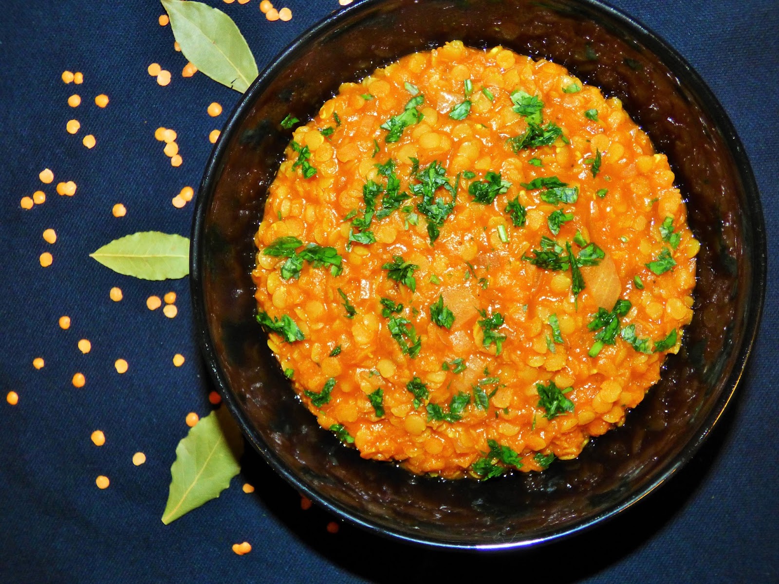 Cebule i czosnek obrać, posiekać i podsmażyć na oleju. Do tego dodajemy wszystkie przyprawy, podsmażamy chwile, aby uwolniły swój aromat a następnie dolewamy wodę. Soczewice dokładnie płuczemy 3 razy, następnie dodajemy do cebulki. Podlewamy wodą, tak aby soczewica była przykryta. Pomidory zalewamy wrzątkiem, następnie obieramy ze skorki, kroimy w kostkę i dodajemy do soczewicy. Od czasu do czasu mieszamy. Gdy soczewica będzie miękka, dodajemy koncentrat. Mieszamy i przyprawiamy do smaku. Natkę pietruszki siekamy i posypujemy nią gotową potrawę. Podajemy z chlebkiem Naan lub z dowolnym pieczywem.