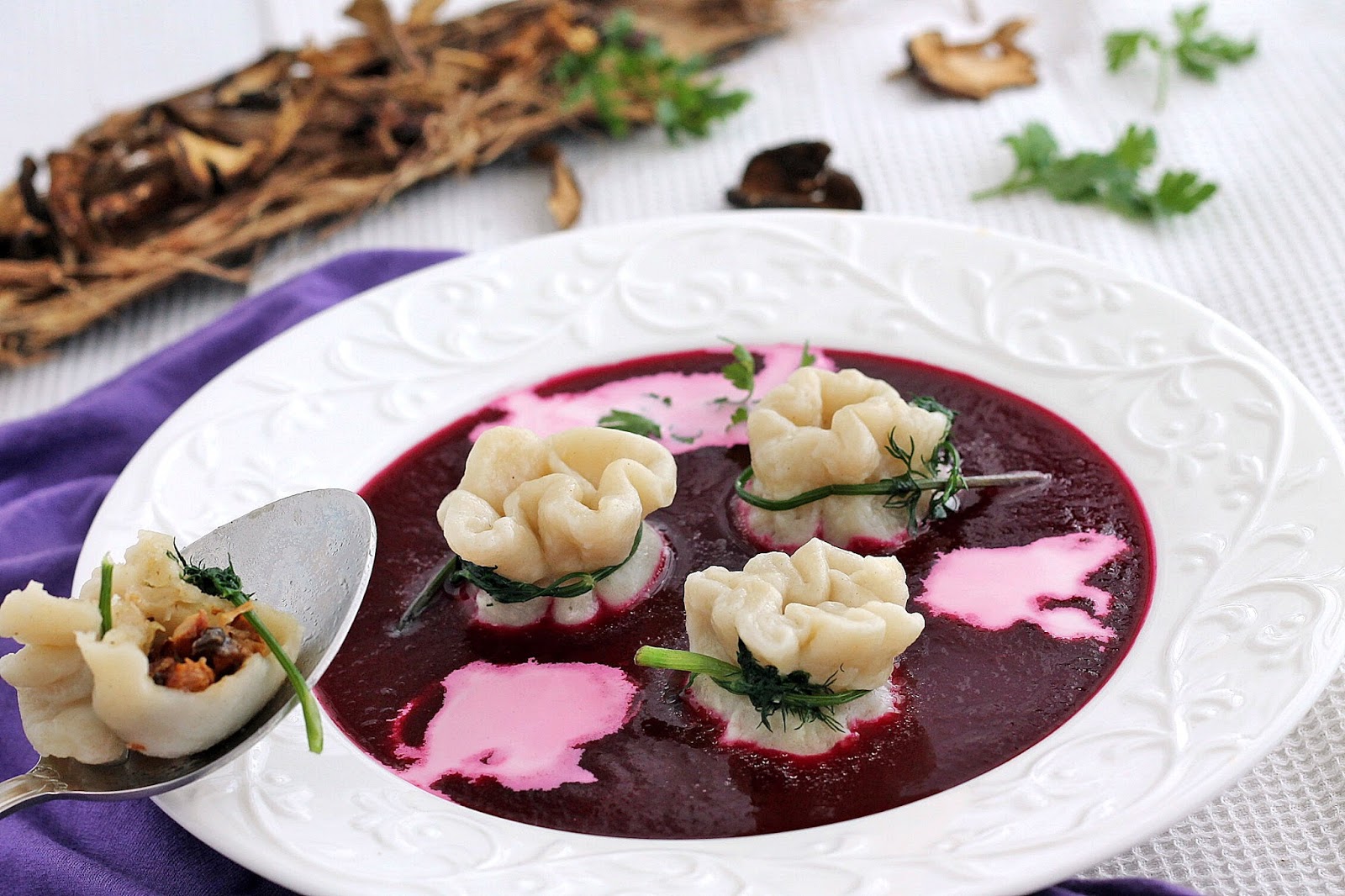 Barszcz z buraków pieczonych z sakiewkami z grzybami