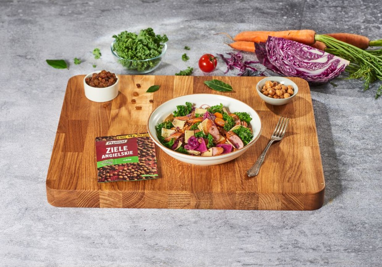 W garnku rozgrzewamy olej i podsmażyć cebulę. Dodajemy kiełbaski, doprawiamy Ziołami kuchni polskiej Prymat. Dodajemy kapustę, marchewkę oraz masło i doprawiamy Kminkiem mielonym Prymat. Całość mieszamy i smażymy do miękkości warzyw. Pod koniec dodajemy ugotowany makaron. Całość mieszamy, doprawiamy solą i pieprzem do smaku, na koniec dodajemy jarmuż i mieszamy.