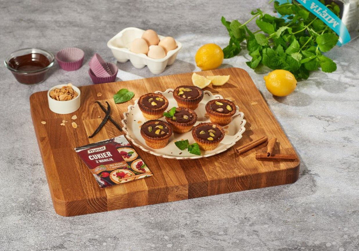 Gotowe, mleczne babeczki polewamy cynamonową czekoladą i posypujemy pistacjami.