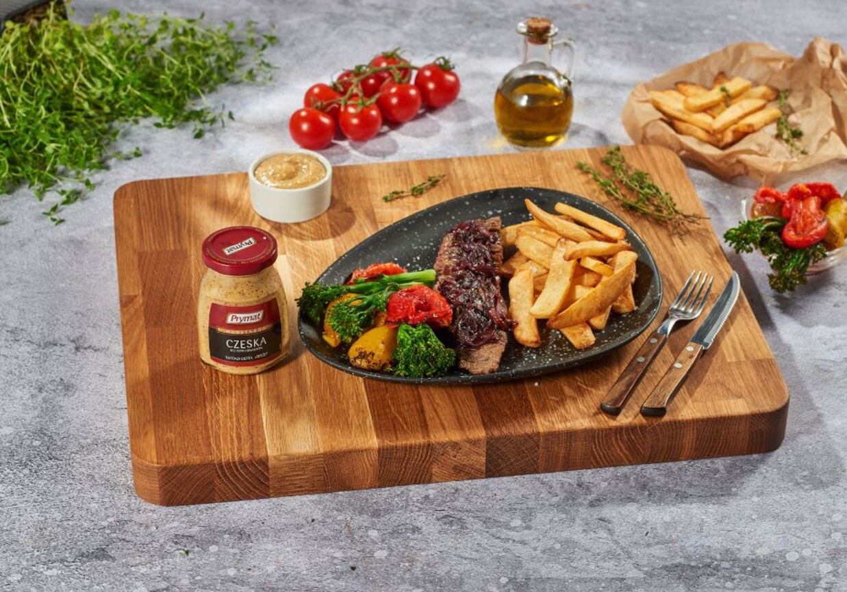 Stek smażymy po ok. 4 min z każdej strony. Mięso podajemy z karmelizowanymi warzywami oraz frytkami.